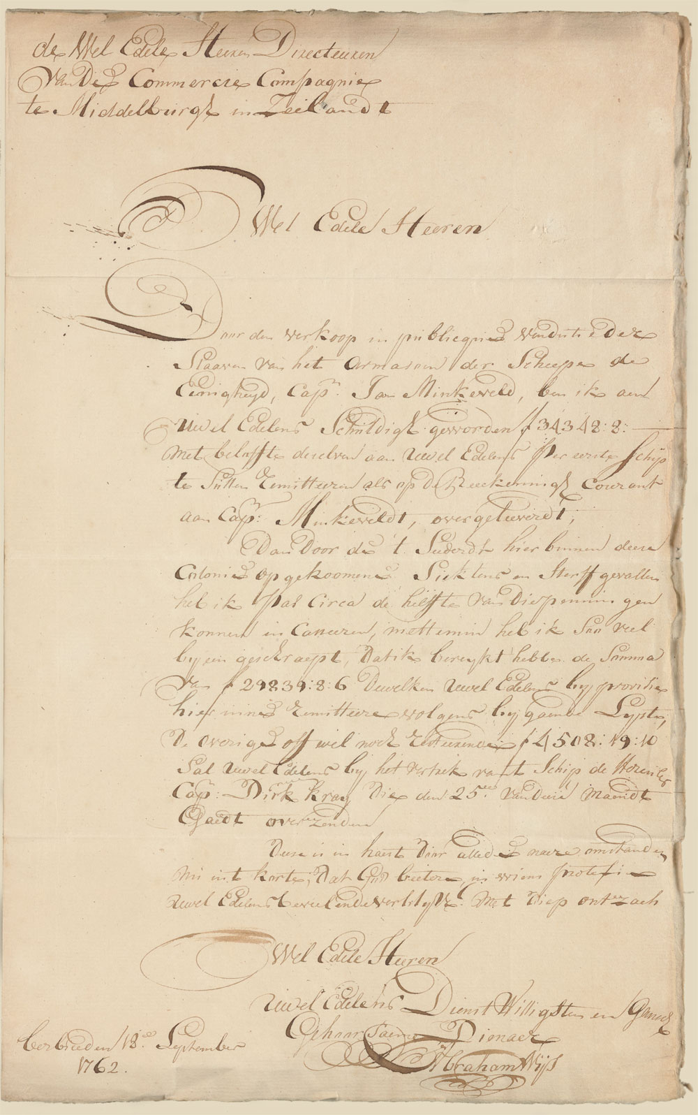 Because of the sale of the cargo of slaves of the ship The Unity, captain Jan Menkenveld, via public auction, I owe your Honourable Sirs the sum of ƒ 34.348:8:- with the promise to send this sum with the first ship to your Honourable Sirs as said on the current account which was given to captain Menkenveld.