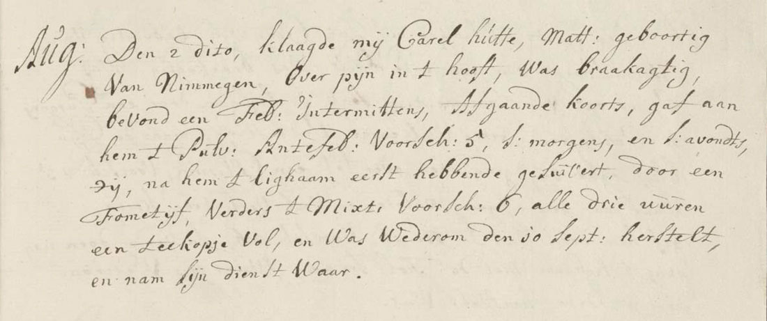 The 2nd of August Carel Hutte from Nijmegen complained to me about headaches and vomiting. Firstly I purged the body with a emetic. Since I found out that he had a febris intermittens, sporadic fever, I gave him a three scruple of a pulverized anti-fever (Prescription 5) for in the morning and the evening. Furthermore I gave him a mixture (Prescription 6) of which he had to take one teacup every three hours. He was again recovered on the 10th of September and took his shift.