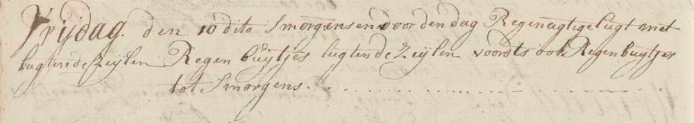 ’s Morgens en door den dag regenagtige lugt met regenbuijtjes, lugten de zeijlen, voordts ook regenbuijtjes tot ’s morgens.