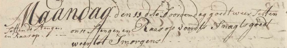 Door den dag goedt weer, setten onse stengen en raas op, voordts ’s nagts goedt weer tot ’s morgens.