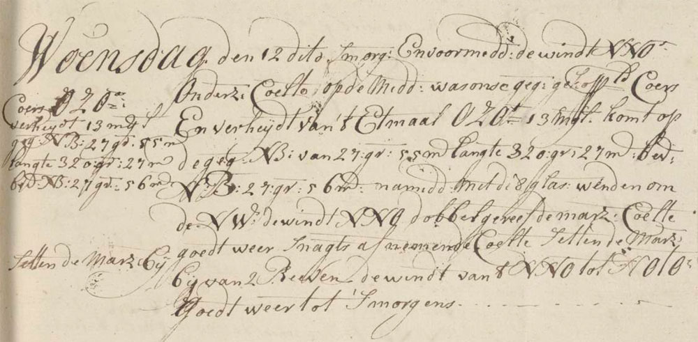 ’s Morgens en voormiddag de windt NNO onderzeijlcoelte, op de middag was onse gegiste gekoppelde coers en verheijdt van ’t etmaal OZO 13 mijl, komt op de gegiste NB van 27°55′ langte 320°27′, bevonden NB 27°56′, namiddag met de 8 De lengte van de wachten werd aan de hand van zandlopers gemeten. Elke wacht bestond uit 8 glazen van een half uur, aangegeven door een bel.glasen wenden om de NW, de windt NNO Zeil waarbij de reven twee keer zijn ingenomen om het zeiloppervlak te verkleinen.dobbelgereefde marzeijlcoelte, goedt weer, ’s nagts afnemende coelte, setten de marzeijlen bij van 2 reeven, de windt van ’t NNO tot NOtO, goedt weer tot ’s morgens.