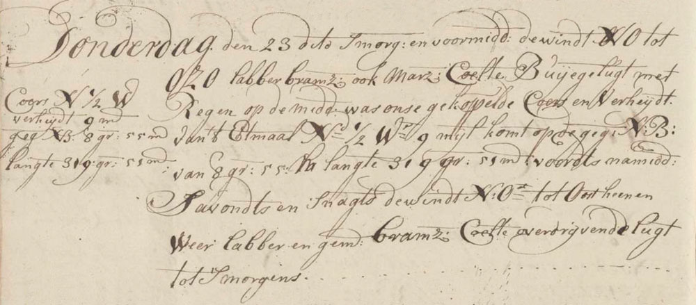 ’s Morgens en voormiddag de windt NO tot OZO labber, bramzeijl- ook marzeijlcoelte, buijege lugt met regen, op de middag was onse gekoppelde coers en verheijdt van ’t etmaal N½W 9 mijl, komt op de gegiste NB van 8°55′ langte 319°51′, voordts namiddag, ’s avondts en ’s nagts de windt NO tot O heen en weer labber en gemiddeldt bramzeijlcoelte, overdrijvende lugt tot ’s morgens.
