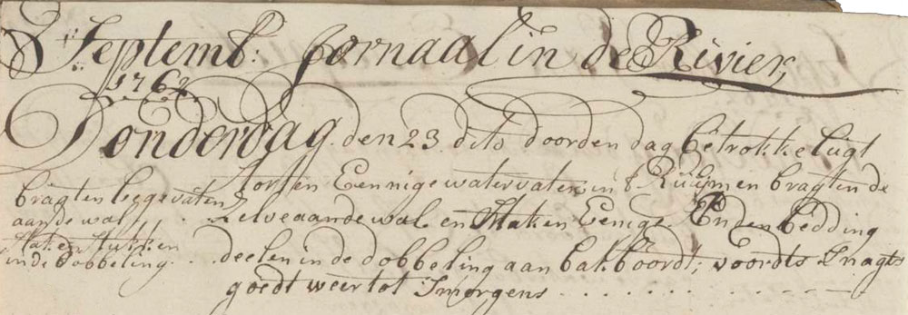 Caraïben 23 september 1762 Essequebo, Guyana Logboek opperstuurman Door den dag betrokke lugt, storten eennige watervaten in ’t ruijm en bragten dezelve aan de wal en staken eenige enden beddingdeelen in de dobbeling aan bakboordt, voordts ’s nagts goedt weer tot ’s morgens. Logboek Tags Geen tags