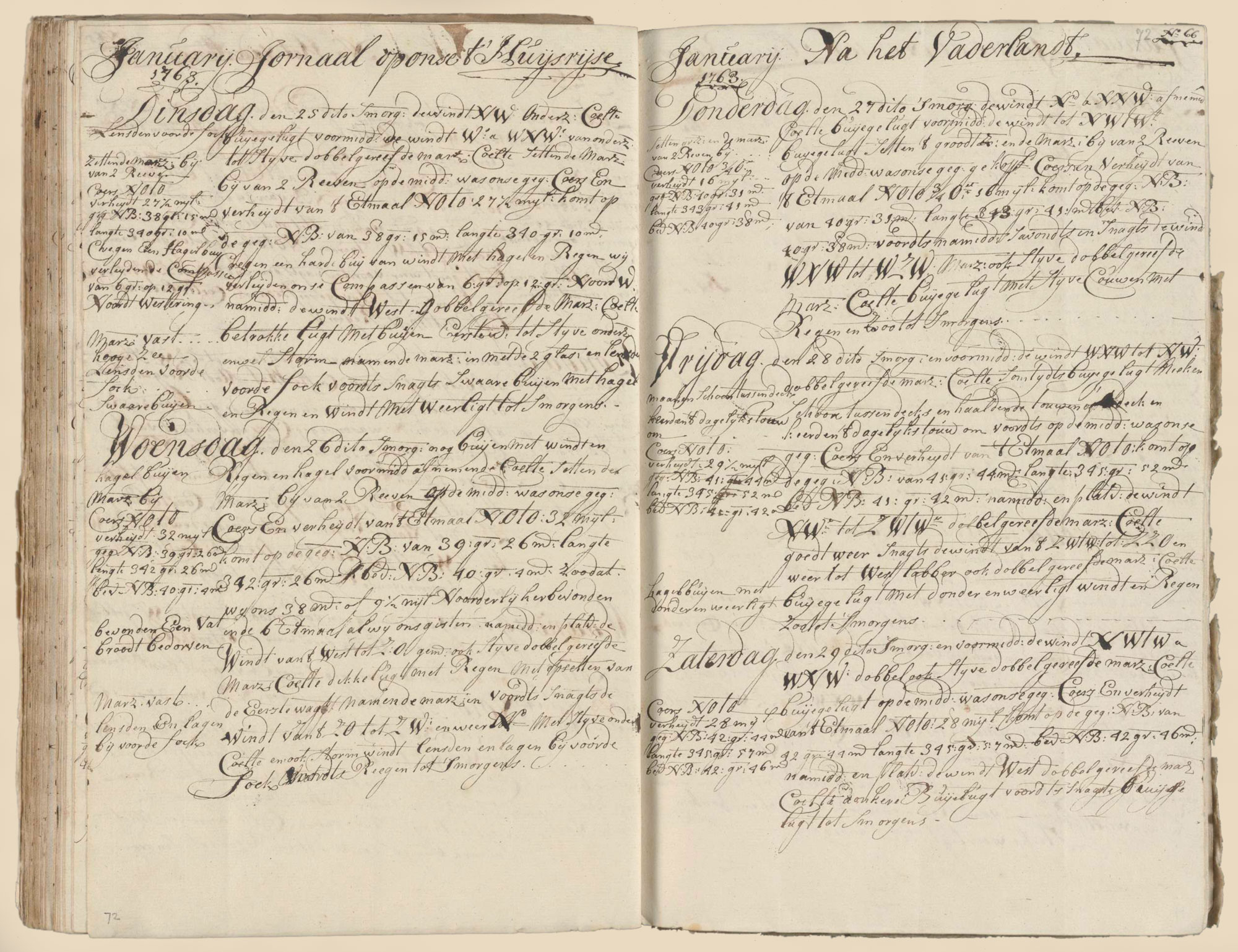 ’s Morgens en voormiddag de windt NWtW à WNW dobbel- ook stijve Zeil waarbij de reven twee keer zijn ingenomen om het zeiloppervlak te verkleinen.dobbelgereefde marzeijlcoelte, buijege lugt, op de middag was onse gegiste coers en verheijdt van ’t etmaal NOtO 28 mijl, komt op de gegiste NB van 42°44′ langte 345°57′, bevonden NB 42°46′, namiddag- en platvoetwagt de windt west dobbelgereefde marzeijlcoelte, donkere buijege lugt, voordts ’s nagts buijege lugt tot ’s morgens.