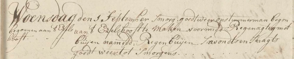 Caribbean 1 September 1762 Essequibo, Guyana First mate’s logbook We had good weather in the morning. Our carpenter began making the cap. In the forenoon it was squally and in the afternoon there were rain showers. We had good weather in the evening and night till morning. Logbook Tags carpenter