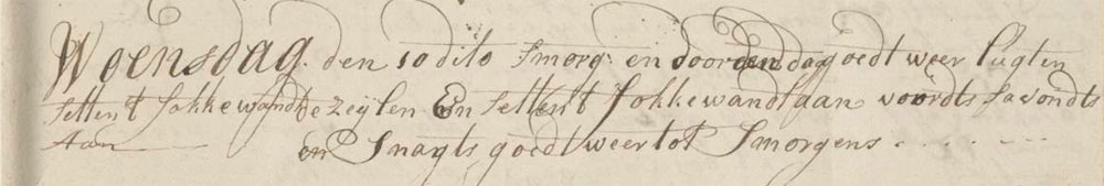 We had good weather in the morning and throughout the day. We aired the sails and put up the fore rigging. Good weather throughout the night, till morning.
