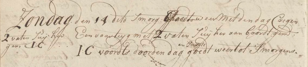 In the morning we had some heavy thunder. We received a vessel with 2 barrels of sugar on board marked I:C. Throughout the rest of the day and night the weather was good, till morning.