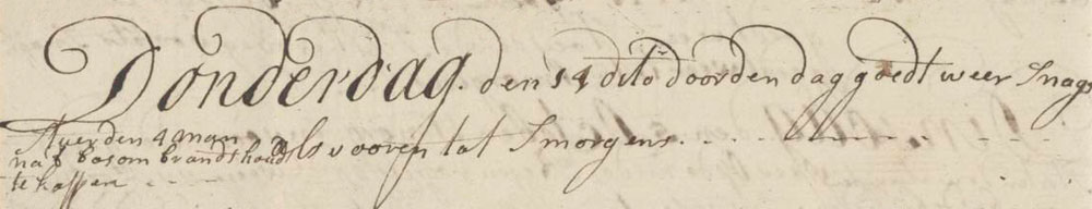 Good weather throughout the day, we sent some folk out into the forest to chop some fire wood. At night same weather till morning.