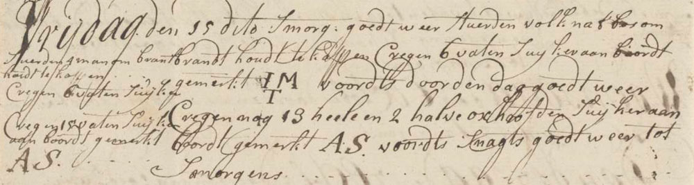 In the morning we had good weather. We sent out some people into the forest to chop fire wood, and received 6 barrels of sugar on board, marked IM/T. Good weather throughout the day. We also received 15 whole and 2 half Unit of volume of 222 Middelburgse jugs. (1 jug = 1,25 liters)hogsheads of sugar on board marked AS. Throughout the night we had good weather till morning.