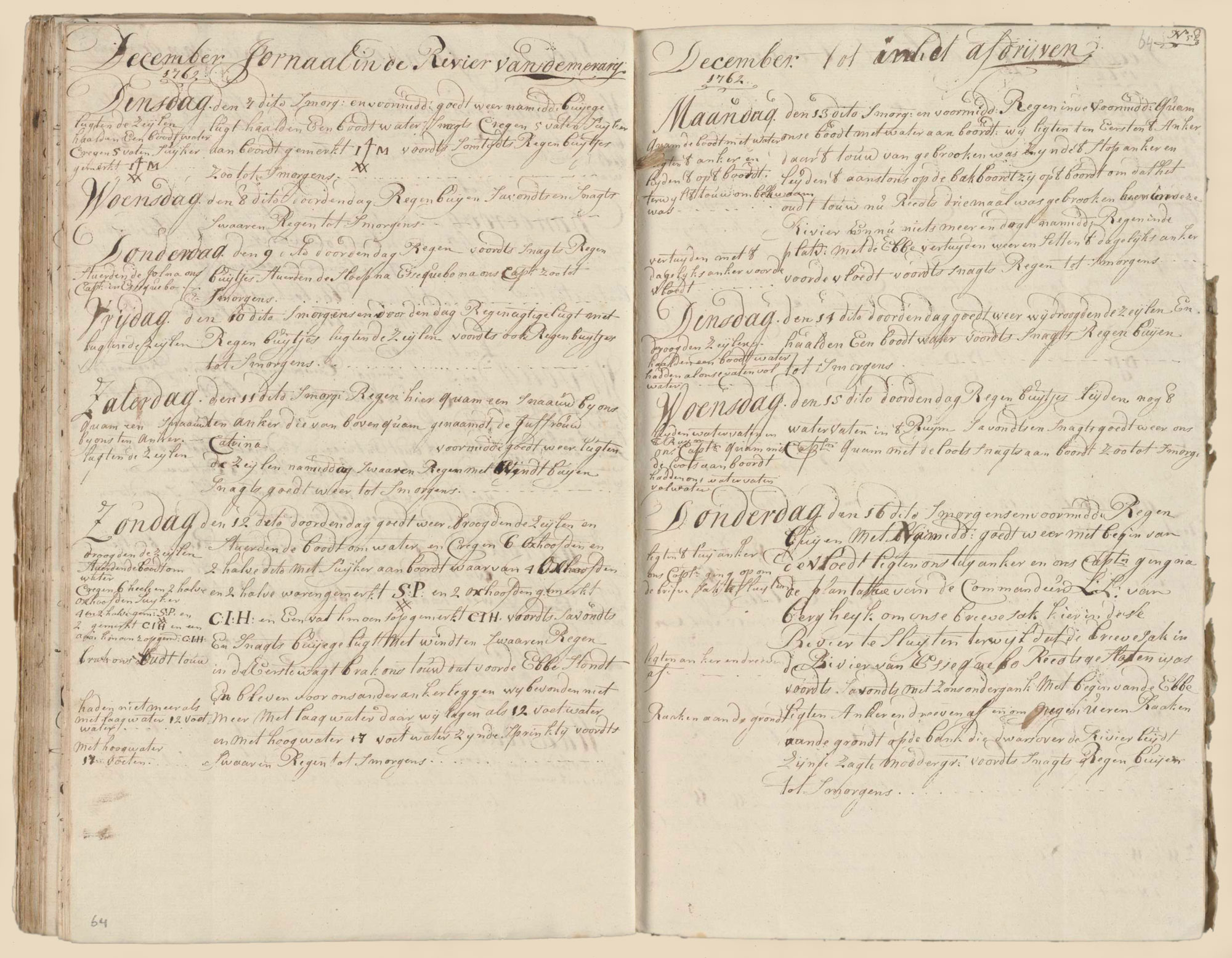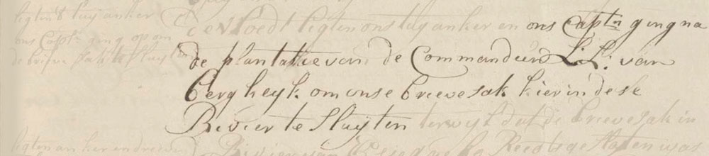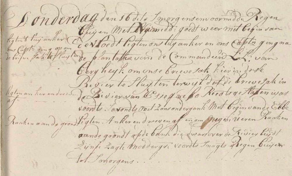 In the morning and forenoon we had showers, in the afternoon the weather was good. At the beginning of high tide we raised the mooring-bower. Our captain went to the plantation of the commander Laurens Lodewijk van Bercheijk, commandeur van DemerarijL.L. van Bergheijk in order to close our Letter bag here at this river, because the letter bag from the Essequibo RiverGuyanariver of Essequibo was already closed. Then in the evening at sunset, at the beginning of the ebb-tide, we raised the anchor and drifted down. At 9 o’clock we were grounded on the bank which lies right across the river and consists of soft muddy ground. Then we had rain through the night until morning.