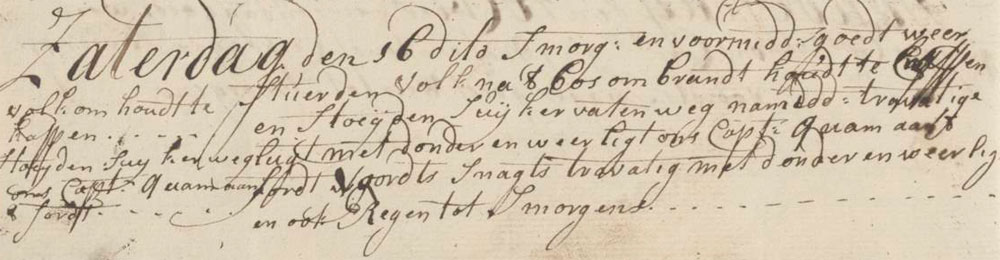 We had good weather in the morning and forenoon. We sent out some folk to the forest to chop fire wood, and we stowed the sugar barrels away. In the afternoon there was a stormy sky with thunder and lightning. Our captain arrived at the fort. Throughout the night it was stormy, with thunder and lightning, and some rain till morning.