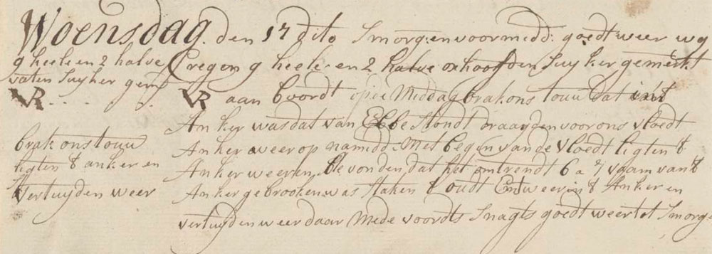 We had good weather in the morning and forenoon. We received 9 whole and 2 half Unit of volume of 222 Middelburgse jugs. (1 jug = 1,25 liters) hogsheads of sugar on board, marked VR. At noon the rope holding the anchor before the ebb broke so we used our flood anchor. In the afternoon, at the start of the high tide, we raised anchor and found that about 6 or 7 1 fathom = 6 feet (170 cm) fathoms of the anchor was broken. We put the wooden end back in the anchor and moored again. At night we had good weather till morning.