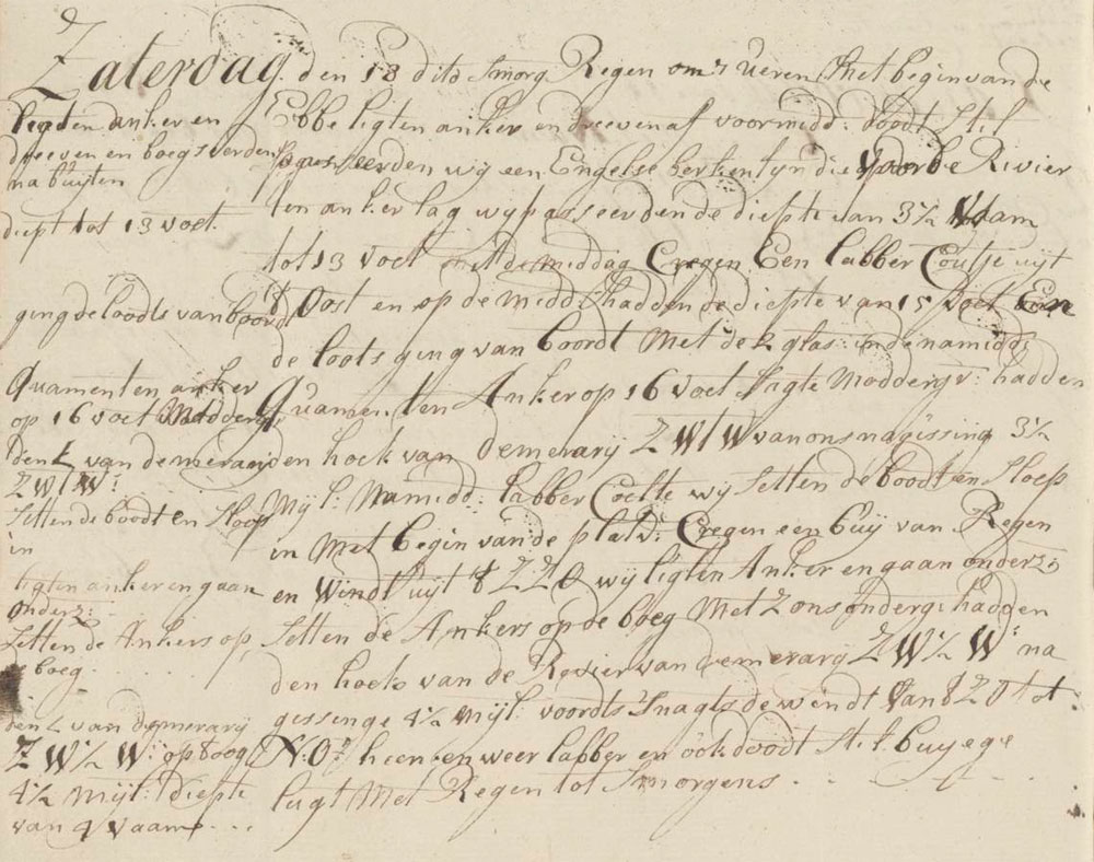 The length of the watches was measured using an hourglass filled with sand. Each watch consisted of 8 half-hour glasses, marked by bells.glasses into the afternoon and we anchored at a measured depth of 16 feet on soft mud. The corner of Demerarij was SW by W of us, at an estimated 3 ½ miles. In the afternoon we had a gentle breeze. We put the boat and rowboat on board. At the beginning of the dog watches we had a shower and a SSE wind, weighed anchor and set sail, putting the anchors on the bow. At sunset, the corner of the river of
