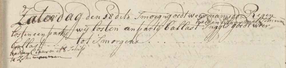 Caribbean 18 September 1762 Essequibo, Guyana First mate’s logbook In the morning we had good weather, but in the afternoon it rained. We unloaded a batch of ballast and finished painting. At night we had good weather till morning. Logbook Tags No tags
