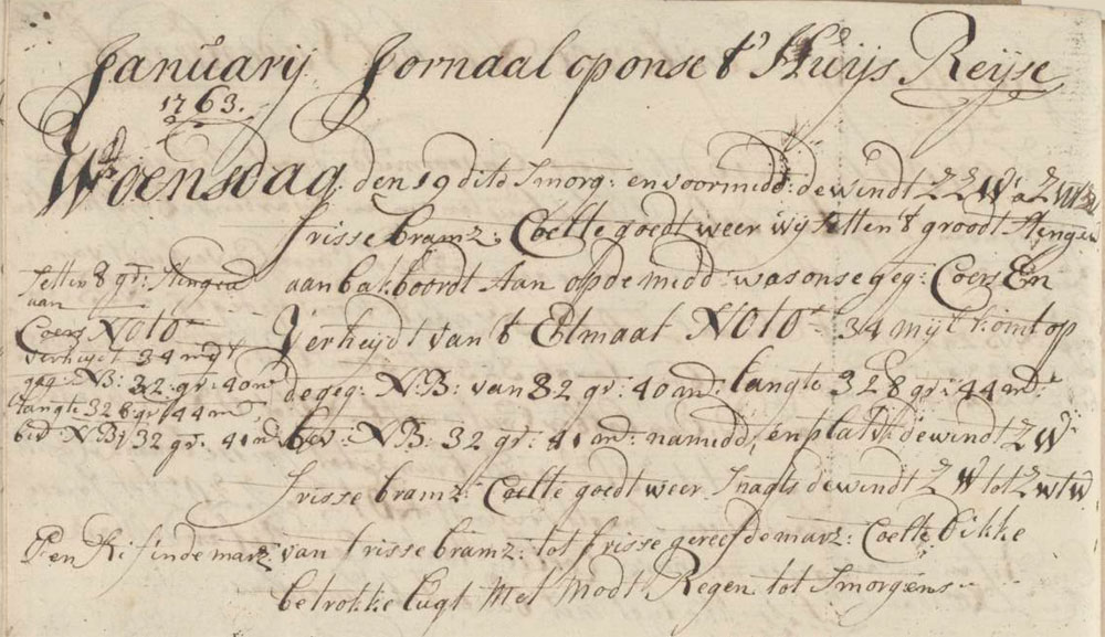 In the morning and forenoon the wind was a fresh topgallant sail breeze coming from the SSW to SW. The weather was good. We put the large topmast shrouds on the port side. At noon our estimated compound course and sailed distance of the last twenty-four hours was NE by E 34 miles, which comes down to the estimated 32°40′ north latitude and 382°44′ longitude. We found the actual north latitude to be 32°44′. During the afternoon watch and dog watches, the wind was a fresh topgallant sail breeze coming from the SW. The weather was good. During the night the wind was a fresh topgallant sail breeze to a fresh reefed topsail breeze. We