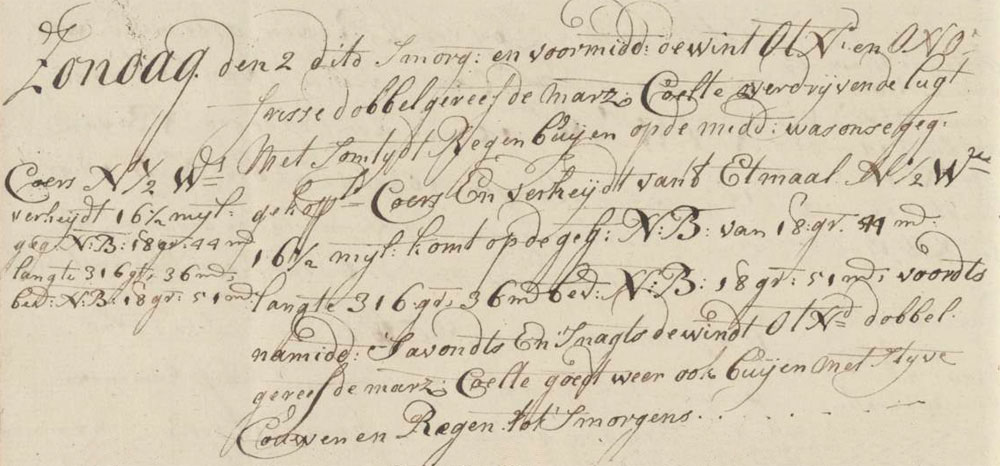 In the morning and forenoon the wind came from E by N and ENE and was a weak Sail of which the surface area has been reduced two times in order to make the surface area smaller.double-reefed topsail breeze. We had cloudy skies with occasional showers. During the afternoon, evening and night the wind came from E by N and was a double-reefed topsail breeze. The weather was good but also had squalls with stiff breezes and rain till morning.
