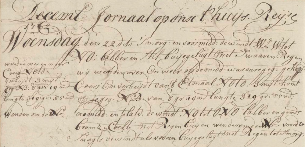 In the morning and forenoon the wind was gentle and quiet from WSW by NE. We had squally skies with heavy rain and tacked back and forth. At noon our estimated compound course and sailed distance of the last twenty-four hours was NE by E 3 miles, getting on the estimated north latitude of 8°19′, longitude 319°55′. During the afternoon watch and dog watches there was a NE by ENE wind. The weather was gentle with an average topgallant sail breeze and showers. We came about N. Then during the night the wind was as before and we had squally skies with rain till morning.