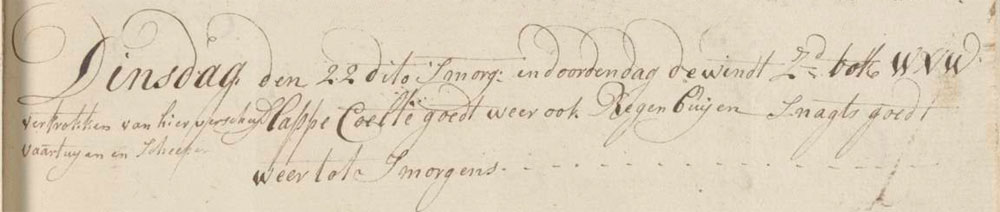 In the morning and through the day the wind was a S and WNW weak breeze and we had good weather with some rain showers, several vessels and ships left from here. At night the weather was good until morning.