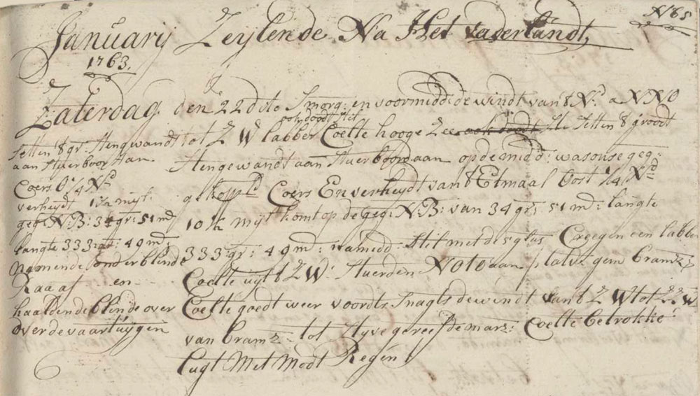 In the morning and forenoon the wind was a gentle breeze coming from the N to NNE. Sometimes the wind was completely still. The sea was high. We put up the large topmast shrouds. At noon our estimated compound course and sailed distance of the last twenty-four hours was ¼ N 10 ½ miles, which comes down to the estimated 34°51′ north latitude and 333°49′ longitude. The wind was still in the afternoon; we removed the spritsail yard and put the spritsail across the boats. When 5 The length of the watches was measured using an hourglass filled with sand. Each watch consisted of 8 half-hour glasses, marked by bells.glasses had run out, we had a gentle breeze from the SW. We steered NE by E. Later the wind was an average topgallant sail breeze and the weather was good. During the night the wind was a topgallant sail breeze to a stiff reefed topsail breeze coming from the SW to SSW. The sky was cloudy with drizzling rain.