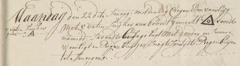 In the morning, at dawn, we received a vessel with 5 barrels of sugar on board marked triangular shapeO. In the afternoon and evening there was a squally sky with thunder, heavy lightning and rain showers. At night some rain, till morning.