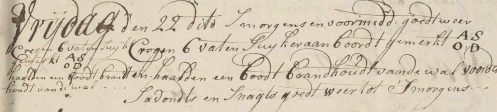 In the morning and forenoon there was good weather. We received 6 barrels of sugar on board marked AS/OD and took in a boatload of firewood from shore. Throughout the evening and night the weather was good, till morning.