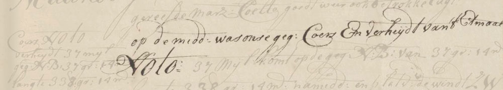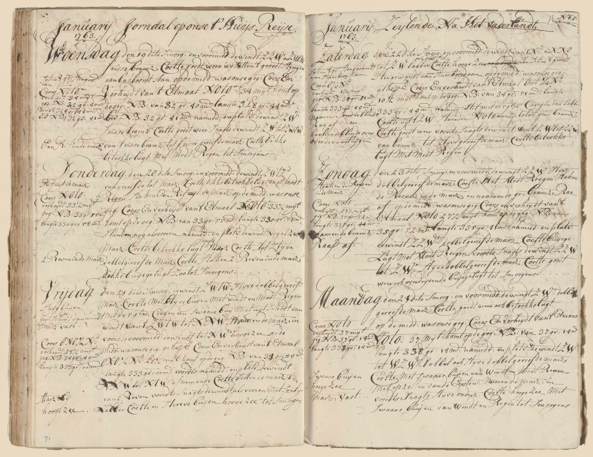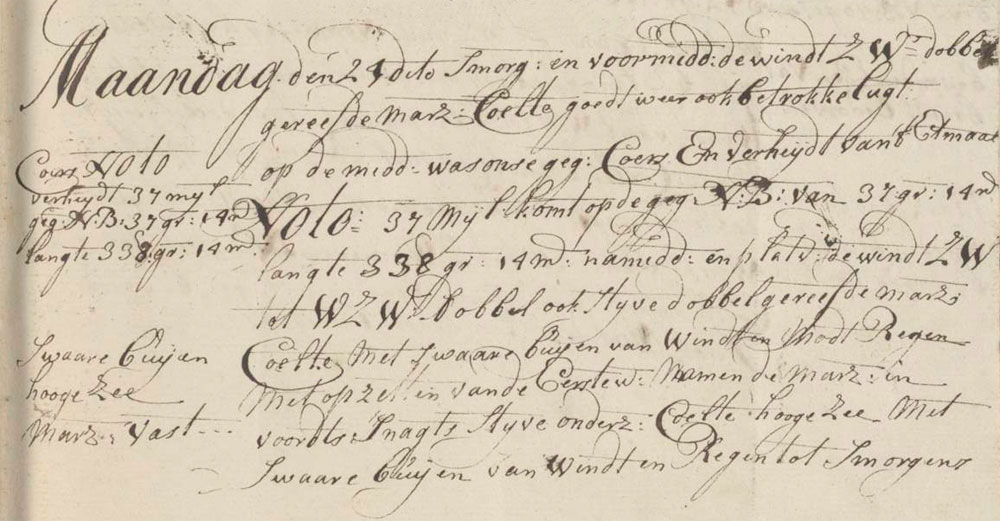 times in order to make the surface area smaller.double reefed topsail breeze coming from the SW. The weather was good, with a cloudy sky. At noon our estimated compound course and sailed distance of the last twenty-four hours was NE by E 37 miles, which comes down to the estimated 37°14′ north latitude and 338°14′ longitude. During the afternoon watch and dog watches the wind was a double reefed and sometimes stiff topsail breeze coming from the WSW with heavy squalls of wind and drizzling rain. At the time of the first watch we