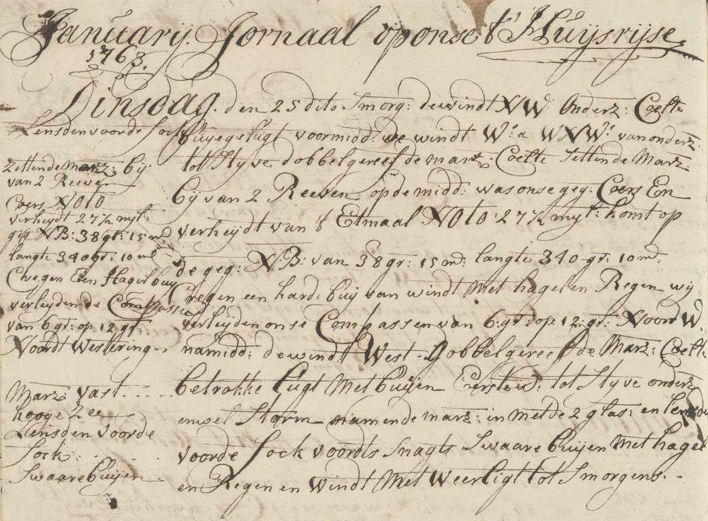 In the morning the wind was a mainsail breeze coming from the NW. The sky was cloudy. In the forenoon the wind was a mainsail breeze to stiff The length of the watches was measured using an hourglass filled with sand. Each watch consisted of 8 half-hour glasses, marked by bells.double reefed topsail breeze, coming from the W to WNW. We put 2 to reefTo reduce the surface area exposed to the wind.reefs in the topsails. At noon our estimated compound course and sailed distance of the last twenty-four hours was NE by E 27 1/2 miles, which comes down to the estimated 38°15′ north latitude and 340°10′ longitude. We had a strong squall of wind, with hail and rain. We reset our compasses from 6° to 12° northwesterly. In the afternoon the wind was a western double reefed topsail breeze. When two The length of the watches was measured using an hourglass filled with sand. Each watch consisted of 8 half-hour glasses, marked by bellsglasses had run out we reefed the topsails and pumped water out of the fore. Throughout the night, we had heavy squalls with hail, rain, wind and lightning till morning.