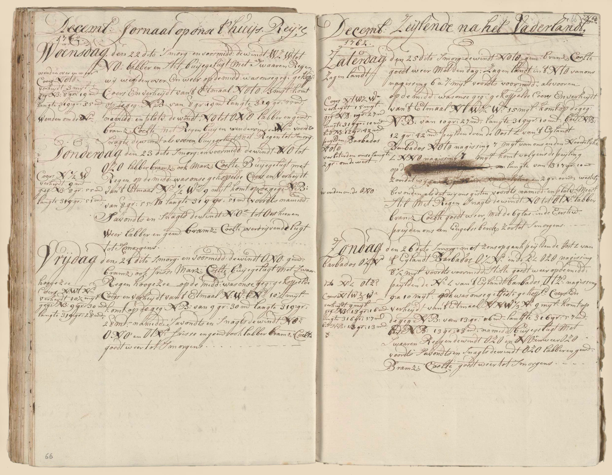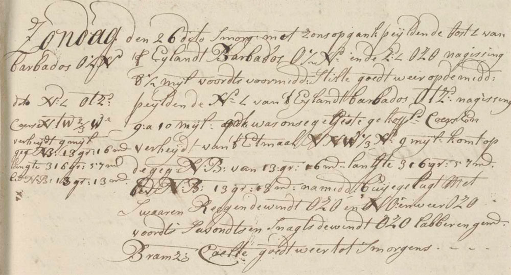 At sunrise we measured the eastern corner of the island of Barbados to be E½N and the southern corner ESE at an estimated 8½ mile. Then during the afternoon the weather was quiet. At noon we measured the northern corner of the island of Barbados to be E by S at an estimated 9 to 10 miles. Also, our estimated compound course and sailed distance of the last twenty-four hours was NNW⅓N 9 miles, getting on the estimated north latitude of 13º16′, longitude 316º57′, with a found north latitude of 13º13′. During the afternoon we squally skies with heavy showers. The wind was ESE and NE and again ESE. Then in the evening and at night the wind was a weak ESE and an average topgallant sail breeze. We had good weather till morning.