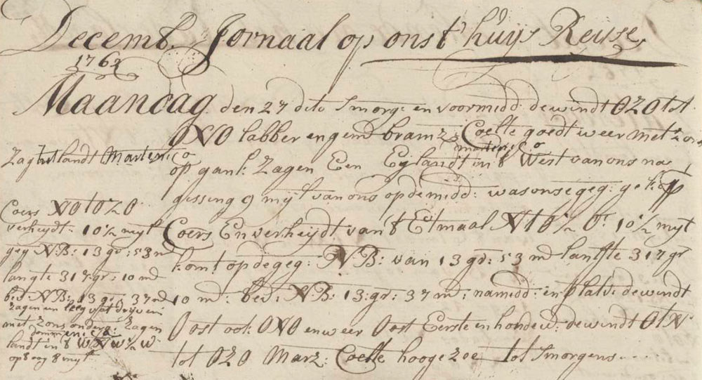 In the morning and forenoon there was a weak and average topgallant sail ESE to ENE breeze and good weather. At sunrise we saw the island MartiniqueWindward IslandsMartenico at an estimated 9 miles west of us. At noon our estimated compound course and sailed distance of the last twenty-four hours was N by E½E 10 ½ miles, getting on the estimated north latitude of 13°53′ longitude 317°10′; we found north latitude to be 13°37′. During the afternoon and dog watches the wind came from E, also ENE and again E. At sunset we saw an empty barrel drifting, and we also saw land: DominicaWindward IslandsDommenica in the WNW½W at an estimated 8 miles. During first and middle watch we had a topsail E by N and ESE breeze. We had high seas till morning.