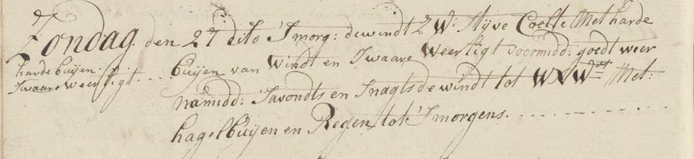 In the morning the wind was a SW stiff breeze with hard squalls of wind and heavy lightning. In the forenoon good weather. In the afternoon, evening and at night the wind to WNW with hail squalls and rain until the morning.