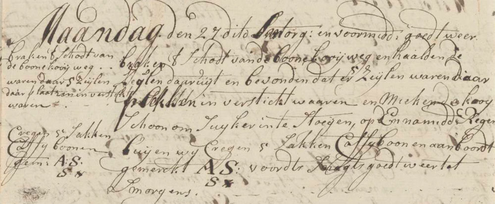 We had good weather in the morning and forenoon. We broke away the partition of the cargo locker and took out the sails. We found 5 sails which had some rotted parts and cleaned out the locker in order to stow sugar there. In the afternoon we had rain showers, and we received 5 sacks of coffee beans on board marked AS/S#. Throughout the night good weather, till morning.