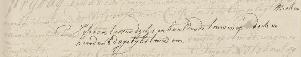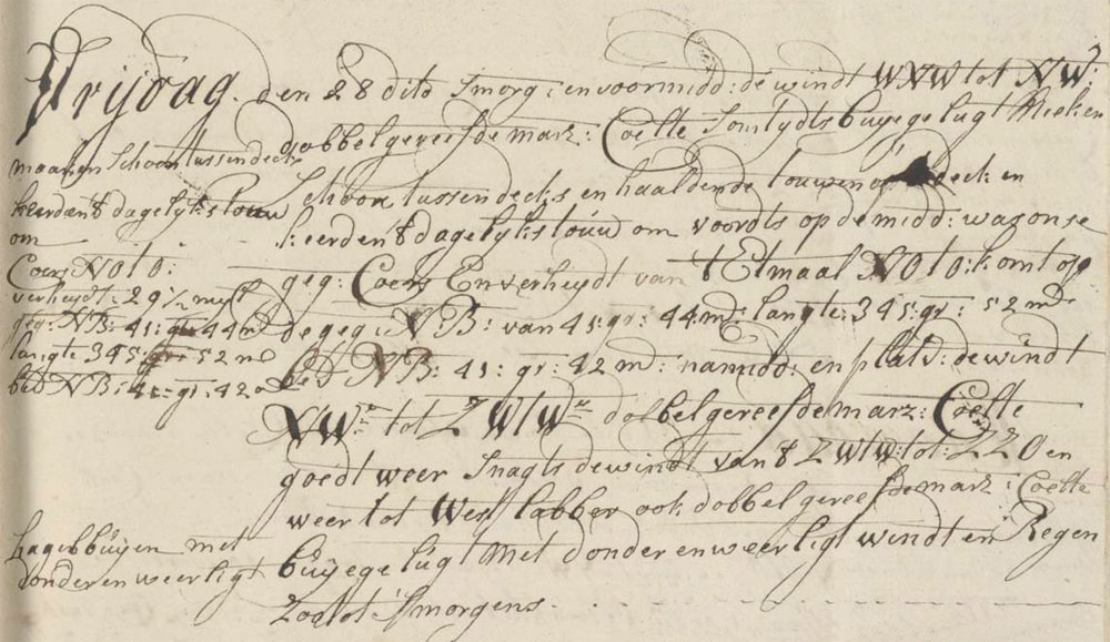In the morning and forenoon the wind was a Sail of which the surface area has been reduced two times in order to make the surface area smaller.double reefed topsail breeze coming from the WNW to the NW with an occasional squally sky. We cleaned the ship and hauled up a range of the cable on deck, and turned around the daily cable. At noon our estimated compound course and sailed distance of the last twenty-four hours was NE by E 29½ miles, which comes down to the estimated 41°44′ north latitude and 345°52′ longitude. We found the actual north latitude to be 41°42′. During the afternoon and dog watches the wind was a double reefed topsail breeze coming from the NW, directed to the SW by W. The weather was good. During the night, the wind was a gentle as well as double reefed topsail breeze with squalls of hail, thunder and lightning and wind and rain. It remained like this until morning.