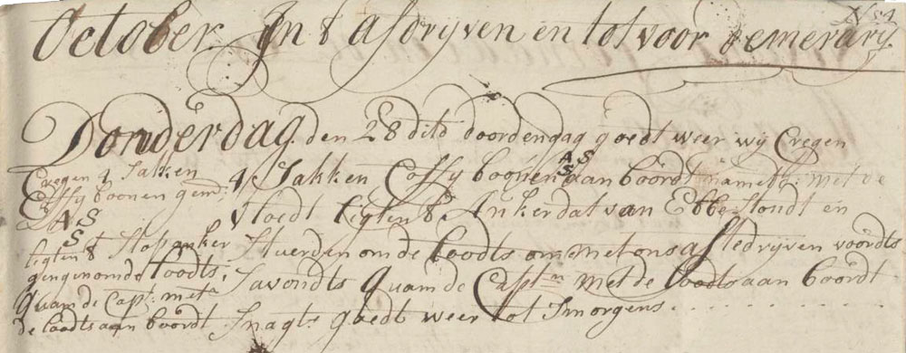 We had good weather throughout the day. We received 4 bags of coffee beans on board, marked AS/S. At the high tide we raised the stream anchor which was located to the ebb, and we sent for the pilot to help us drift down. In the evening the captain came on board with the pilot. We had good weather at night, till morning.
