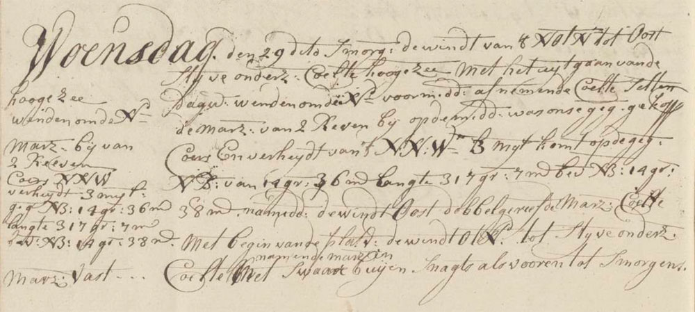 In the morning the wind came from NE by E and E and was a stiff mainsail breeze. We had high seas. At the end of the morning watch we came about N. During the forenoon we had a decreasing breeze and we put two To reefTo reduce the surface area exposed to the wind.reefs in the top sails. At noon our estimated compound course and sailed distance of the last twenty-four hours was NNW 3 miles, getting on the estimated north latitude 14°36′, longitude 317°7′; we found north latitude to be 14°38′. During the afternoon there was an E double reefed top sail breeze and at the beginning of the dog watches we had an E by N stiff mainsail breeze with heavy squalls. We reefed the mainsails. During the night the weather stayed the same, till morning.