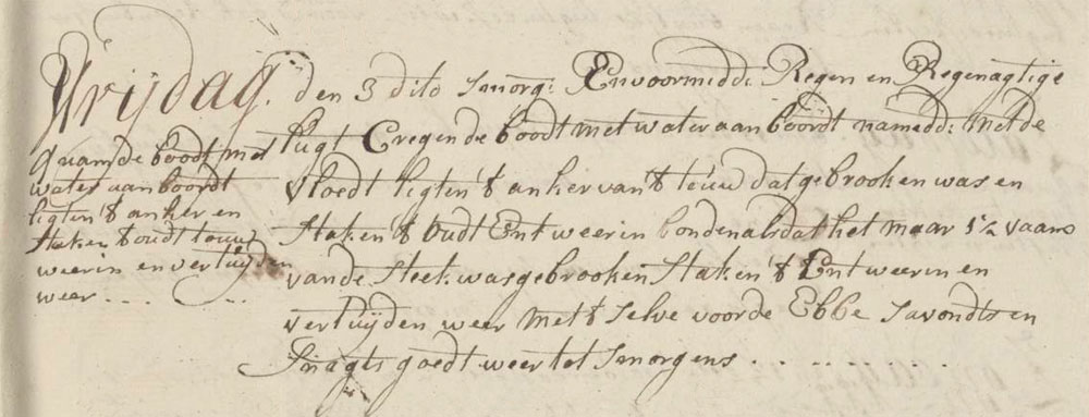 In the morning and forenoon we had rain and rainy skies. The boat came back on board with water. In the afternoon, with the high tide, we raised the anchor of which the rope had broken, then put the old end back: we found that it had only broken 1 ½ 1 fathom = 6 feet (170 cm)fathoms from the knot, so we re-inserted the end bit and used it to more the ship again before the ebb tide. During the evening and night the weather was good until morning.