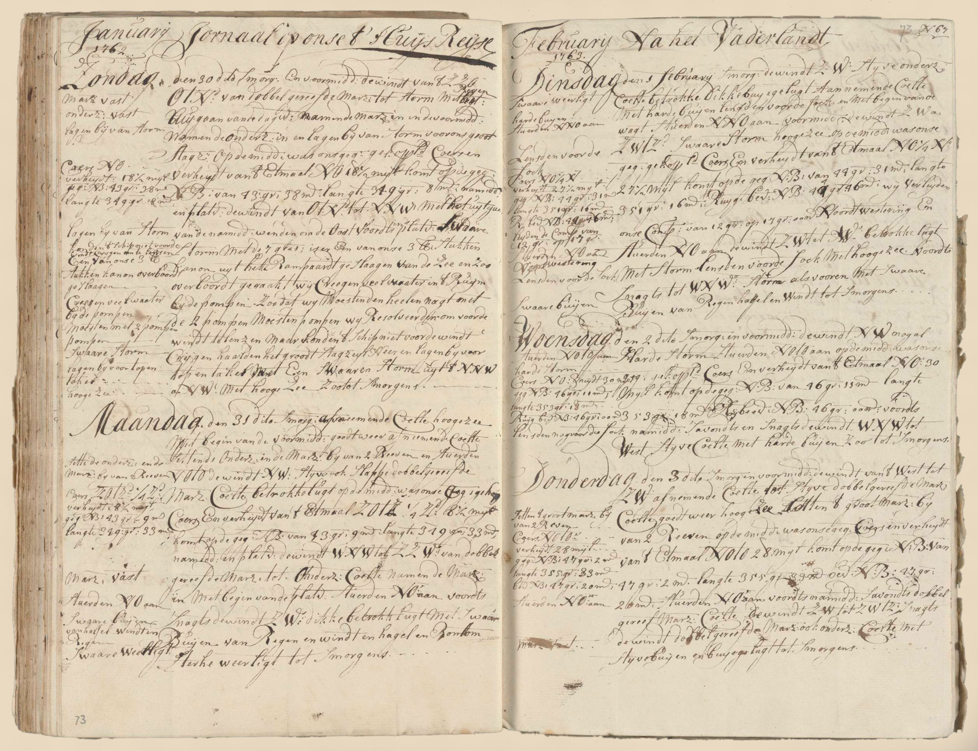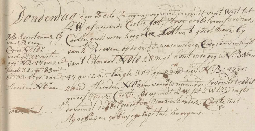 In the morning and forenoon we had a decreasing stiff Sail of which the surface area has been reduced two times in order to make the surface area smaller.double reefed topsail breeze coming from the west to SW. The weather was good and the sea was high. We double To reduce the surface area exposed to the wind.reefed the main topsail. At noon our estimated compound course and sailed distance of the last twenty-four hours was NE by E 28 miles, which comes down to the estimated 47°2′ north latitude and 355°33′ longitude. We found the actual latitude to be 47°20′ and steered towards the NE. During the afternoon and evening the wind was a double reefed topsail breeze coming from the SW to SW by S. At night we had a double reefed topsail breeze and mainsail breeze with stiff squalls and squally weather till morning.