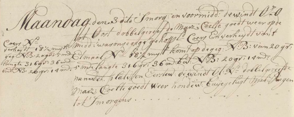 In the morning and forenoon the wind came from ESE and E and was a Sail of which the surface area has been reduced two times in order to make the surface area smaller.double-reefed topsail breeze. The weather was good. At noon our estimated compound course and sailed distance of the last twenty-four hours was N 18½ miles, getting on the estimated north latitude of 20°5’ longitude 316°36’, with a found north latitude of 20°14’. During the afternoon, dog and first watches the wind came from E by N and was a double-reefed topsail breeze. The weather was good. During the middle watch we had squally skies with rain, till morning.