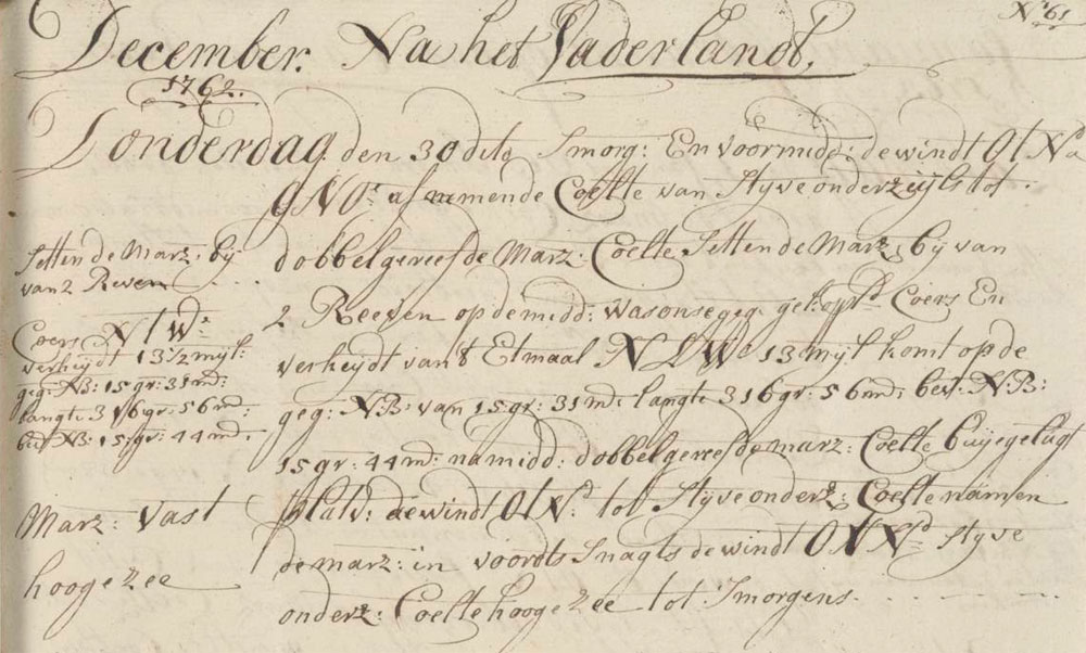 In the morning and forenoon the wind came from E by N to ENE and was a decreasing breeze from a stiff mainsail breeze to a Sail of which the surface areadouble reefed topsail breeze. We added tow reefs to the top sails. At noon our estimated compound course and sailed distance of the last twenty-four hours was N by W 13 miles, getting on the estimated north latitude of 15°31′ longitude 316°56′ with a found north latitude of 15°44’. In the afternoon we had a double-reefed topsail breeze and squally skies. During the dog watches there was an E by N stiff mainsail breeze. We lowered the top sails. Then during the night we had wind from E by N and it was a stiff mainsail breeze. We had high seas till morning.