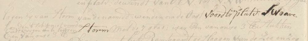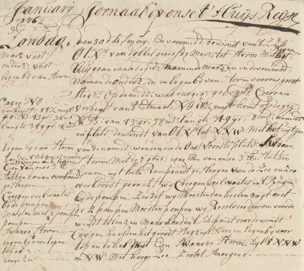 The length of the watches was measured using an hourglass filled with sand. Each watch consisted of 8 half-hour glasses, marked by bells.glasses had run out, one of our 3 pound canons was struck off the gun carriage and fell overboard. We had a lot of water streaming in our hold at the pumps so we’ve had to pump with only 2 pumps for the entire night. We decided to sail into the wind but we did not manage to turn the ship before the wind. We put down the main staysail and continued without any sails with a heavy NNW by NW storm and high sea, till morning.