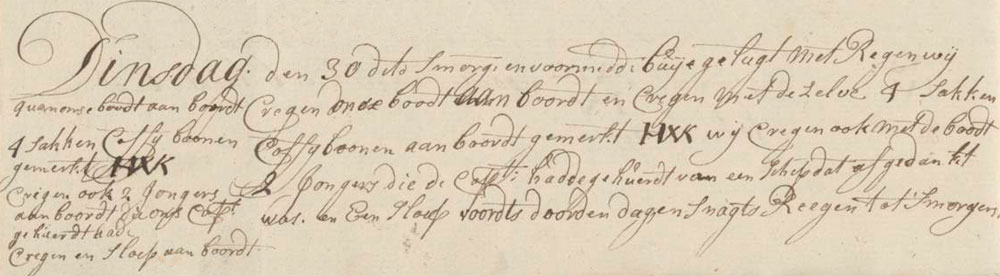 We had a squally sky with rain in the morning and forenoon. We took in our boat, together with her load of 4 sacks of coffee beans marked HXK and 2 boys whom the captain had hired from a ship which had been scrapped, and a rowboat. We had rain throughout the day and night, till morning.