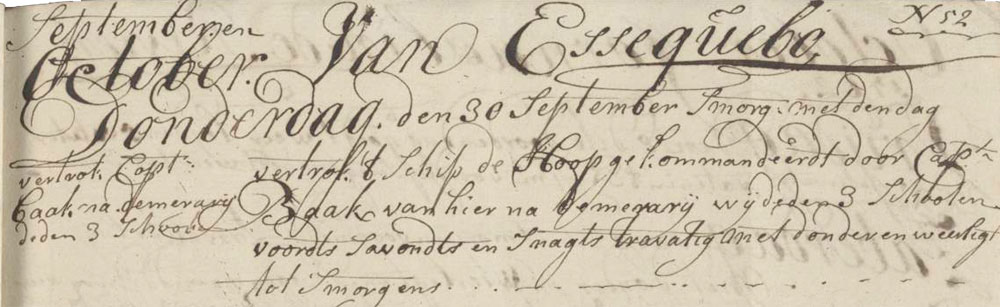 In the morning at down the ship The Hope, commanded by captain Baak left from here to Demerarij. We fired 3 As greeting.shots. Throughout the evening and night it was stormy, with thunder and lightning till morning.