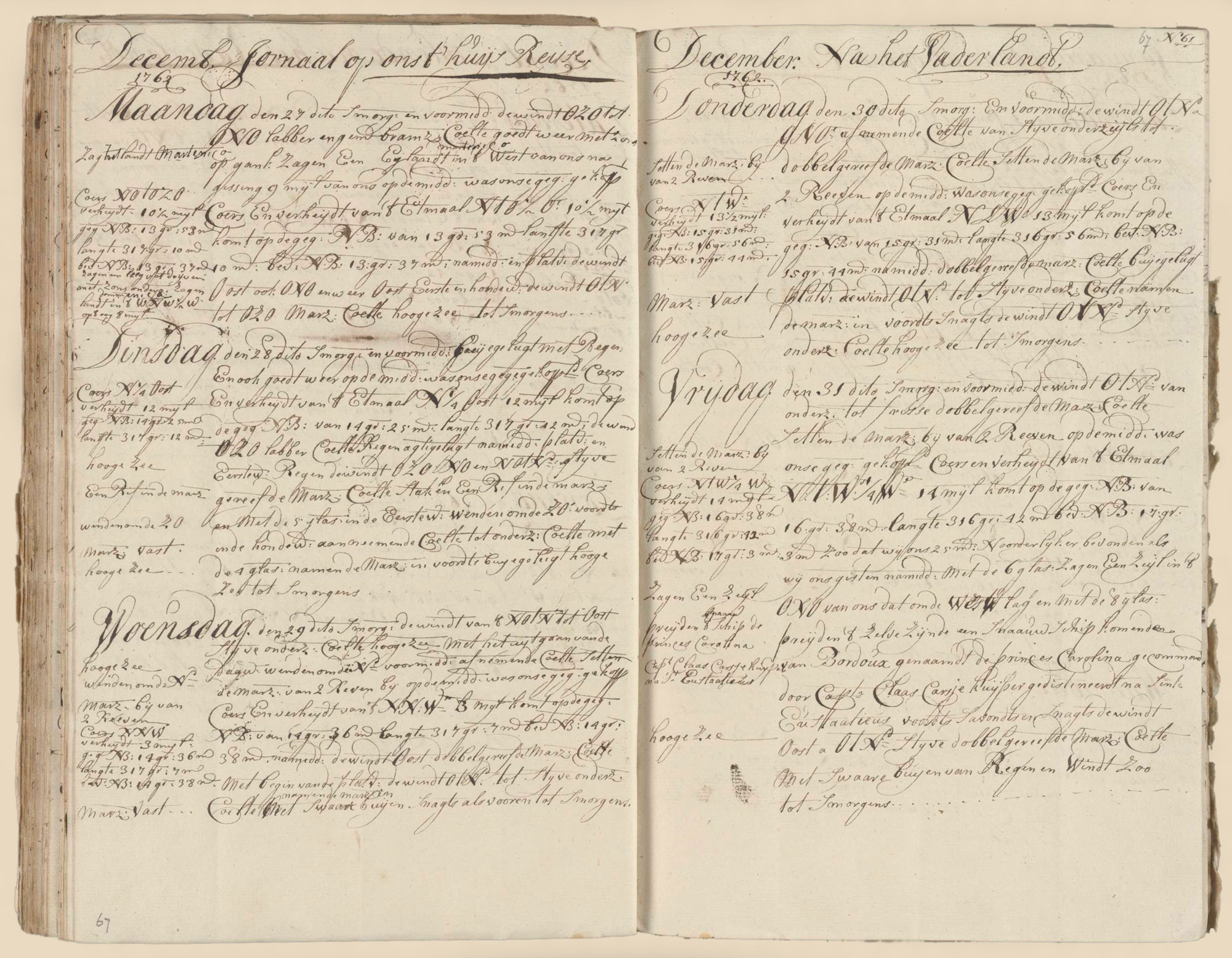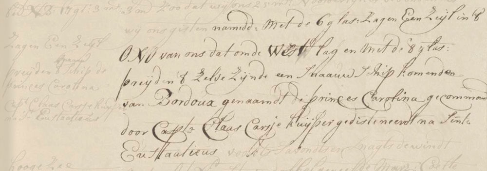 In the morning and forenoon the wind came from E by N and was a mainsail and a weak Sail of which the surface areadouble-reefed topsail breeze. We added two reefs to the topsails. At noon our estimated compound course and sailed distance of the last twenty-four hours was N by W¼W 14 miles, getting on the estimated north latitude of 16°38′ , longitude 316°42′; we found north latitude to be 17°3′. We were 25′ more north than estimated. In the afternoon when 6 The length of the watches was measured using an hourglass filled with sand. Each watch consisted of 8 half-hour glasses, marked by bells.glasses in the watch had run out we saw a sail ENE of us. When 8 glasses in the watch had run out we hailed that ship: it was a snow ship named the Princess Carolina and commanded by Captain Claas Carsje Kuijper, coming from BordeauxFranceBordoux and destined for Sint EustatiusCaribbeanSinte Eustaatieus. During the evening and night we had an E to E by N stiff double-reefed topsail breeze. We had heavy squalls of rain and wind till morning.