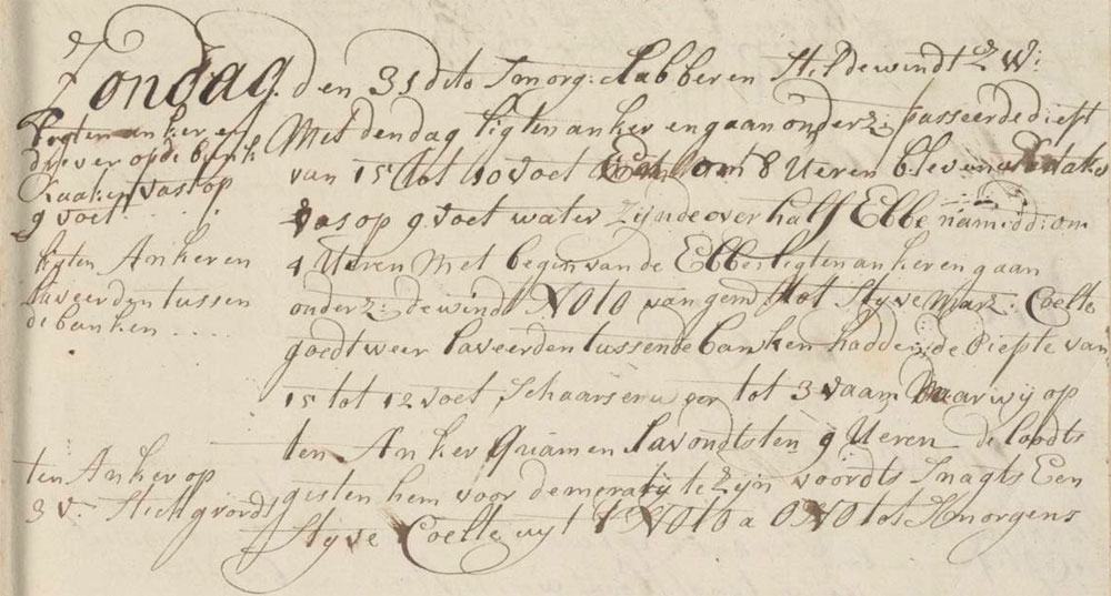 In the morning the wind was gentle and calm, coming from the SW. At dawn we raised anchor and set sail, passing a depth of 15 to 10 feet. At 8 ‘o clock we remained at a depth of 9 feet of water and to the half-ebb. In the afternoon, at 4 ‘o clock and the start of the ebb we raised anchor and set sail with a moderate to stiff topsail NE to E breeze and good weather. We tacked between the river banks, with depths of 15 to 12 feet and again 3 1 fathom = 6 feet (170 cm) fathoms sticky ground. Here we dropped anchor. At evening, about 9 ‘o clock, the pilot guessed us to be before Demerarij. At night we had a stiff breeze from the NO by E to the ENE, till morning.