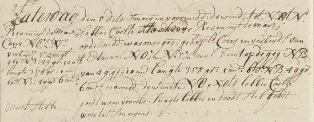 In the morning and forenoon the wind was a gentle breeze directed to the NE by N. We removed the To reduce the surface area exposed to the wind. reeves from the topsails. At noon our estimated compound course and sailed distance of the last twenty-four hours was NE ½ N 5 ½ miles, which comes down to the estimated 49°10′ north latitude and 358°1′ longitude. We found the actual latitude to be 49°6′. In the afternoon, the wind was a gentle breeze coming from between the NE and NE by E. The weather was good. At night there was a gentle breeze and sometimes completely still. The weather remained good until the next morning.