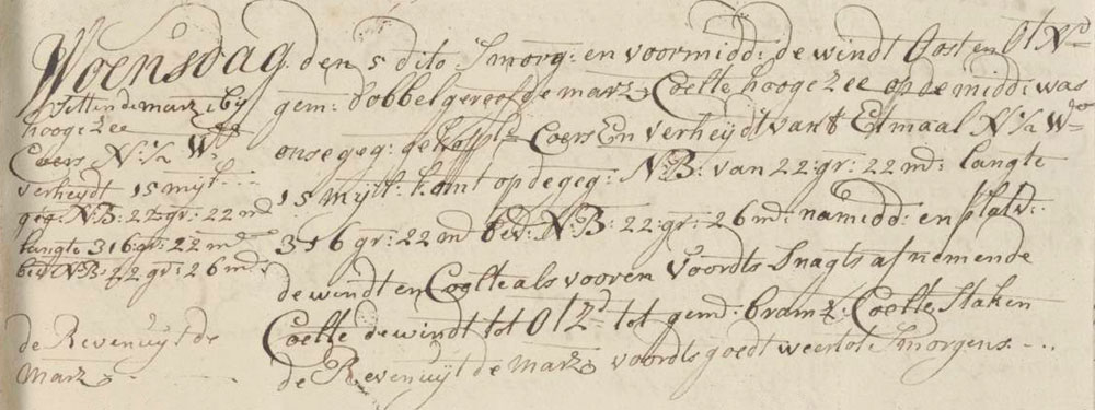 In the morning and forenoon the wind came from E and E by N and was a average Sail of which the surface area has been reduced two times in order to make the surface area smaller.double-reefed topsail breeze. We had high seas. At noon our estimated compound course and sailed distance of the last twenty-four hours was N½W 15 miles, getting on the estimated north latitude of 22°22’ longitude 316°22’, with a found north latitude of 22°26’. During the afternoon and dog watches the wind and breeze were as before. Then during the night the breeze became more quiet. The wind came from E by S and was an average topgallant sail breeze. We took the reefs from the top sails. Good weather till the morning.