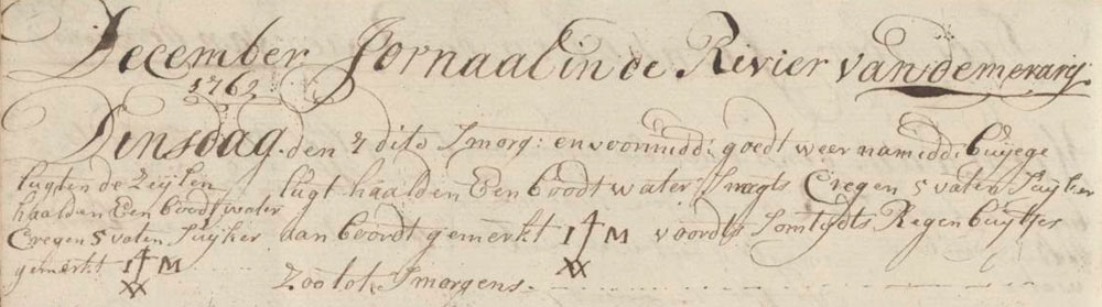 In the morning and forenoon the weather was good. In the afternoon we had squally skies. We sent a boat to fetch water. At night we got 5 barrels sugar on board, the barrels were branded 4/IM/XX. Then we had some showers. This stayed the same until morning.