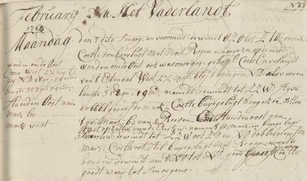 In the morning and forenoon there was an ESE and S by E mainsail breeze with a dark sky, drizzling rain and high sea. At noon we came about east. Our estimated compound course and sailed distance of the last twenty-four hours was W 2 ½ miles, coming down to an estimated north latitude as before, longitude 358°19′. In the afternoon we had a SSW stiff, Sail of which the surface area has been reduced two times in order to make the surface area smaller.double-reefed topsail breeze with squally skies and a high sea. We put two reefs in the large topsail and steered E. At the start of the first watch we took in the large topsail. There was a squally sky with a double reefed topsail breeze to the SSW, also SW and NO and a calm. We had a squally sky with rain. In the middle watch there was a NT to N average topgallant sail breeze and good weather till morning.