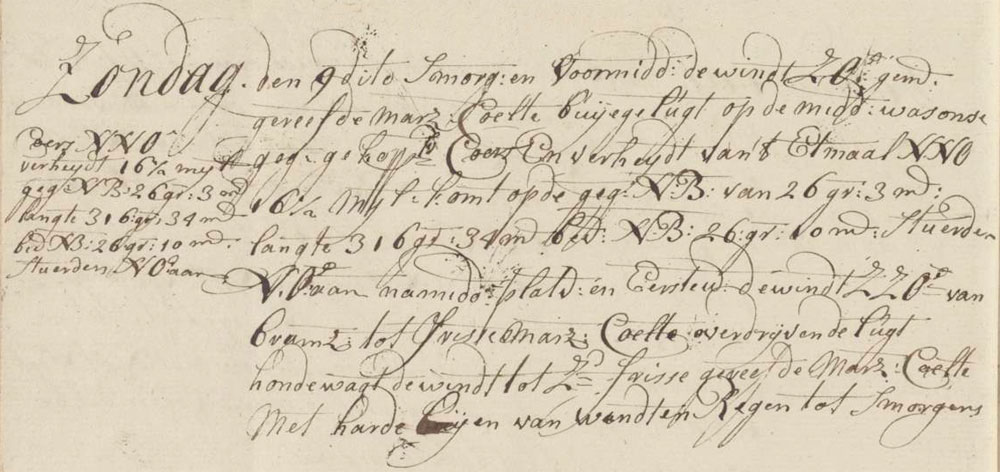 In the morning and forenoon there was an average reefed topsail breeze from SE with a squally sky. At noon our estimated compound course and sailed distance of the last twenty-four hours was north northeast and 16½ miles, which comes down to the estimated 26°3′ north latitude and 316°34′ longitude. We found the actual north latitude to be 26°10′ and steered NE. During the afternoon watch, the dog watches and the first watch there was a topgallant sail breeze and drifting clouds. During dog watches we had a fresh reefed topsail breeze with strong squalls of wind and rain till morning.