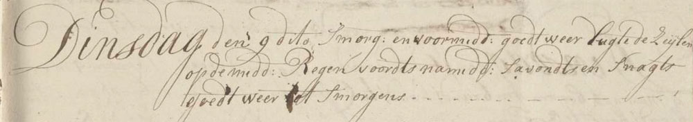 We had good weather in the morning and forenoon, so we aired the sails. At noon we had rain, but in the afternoon, evening and night we had good weather, till morning.