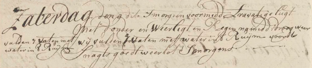 Caribbean 9 October 1762 Essequibo, Guyana First mate’s logbook In the morning and forenoon there was stormy sky, together with thunder, lightning and rain. In the afternoon we had dry weather. We filled 7 barrels with water in the hold. Throughout the night good weather till morning. Logbook Tags No tags